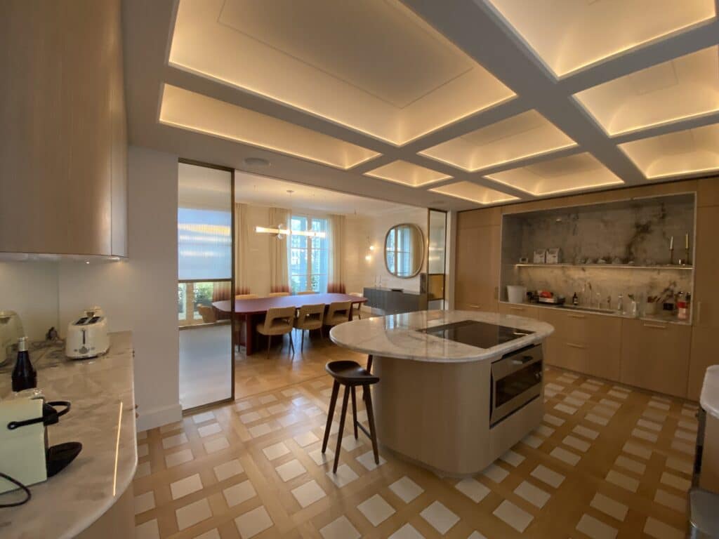 ➡ Eclairage du plafond, éclairage réalisé par l’intégration de rubans Led (tunable white) Bilton et pour les corniches Orac